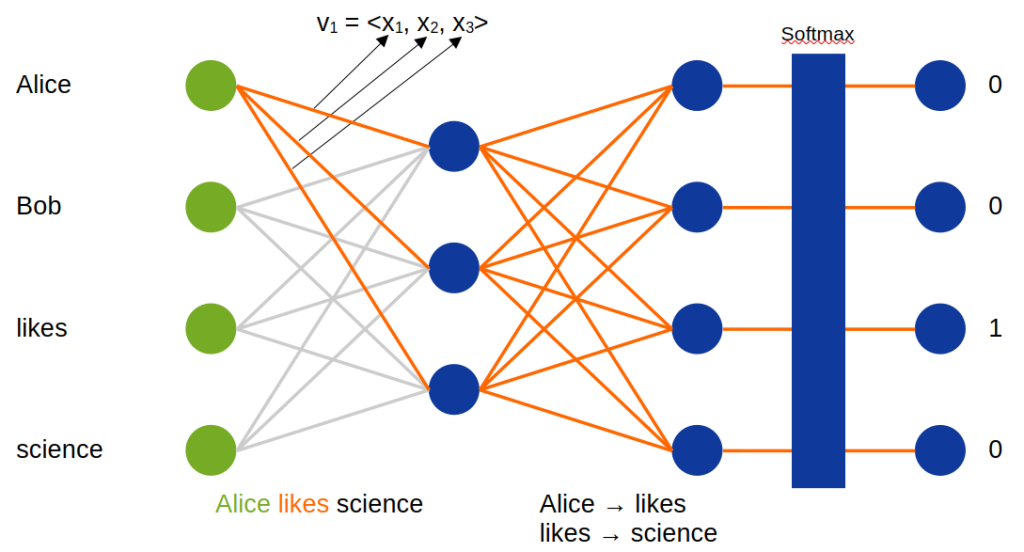 If we want to create embeddings for predicting a next word when typing on a screen keyboard, then from input text, we need to create pairs of words. The first word from a pair is the input and the second is the output. In the example above, we have two pairs, that are alice → likes and likes → science. For the first pair, we set the input vector in a way that word “alice” has value 1 and the rest have value 0 (one-hot encoding). Then, output we set in the same way, but we set value 1 next to the second word from the pair. Finally, we can calculate forwardpass and backpropagate the error, so adjust weights’ values.